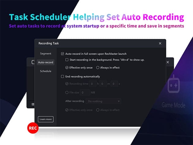 • Auto-recording tasks. Sets recordings to start and/or end automatically & save in segments