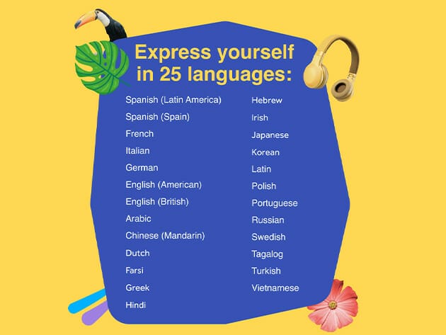 Language: Spanish (Latin America), French, Italian, German, English (American), Arabic, Chinese (Mandarin), Dutch, English (British), Filipino, Greek, Hebrew, Hindi, Irish, Japanese, Korean, Persian (Farsi), Polish, Portuguese (Brazil), Russian, Spanish (Spain), Swedish, Turkish, Vietnamese