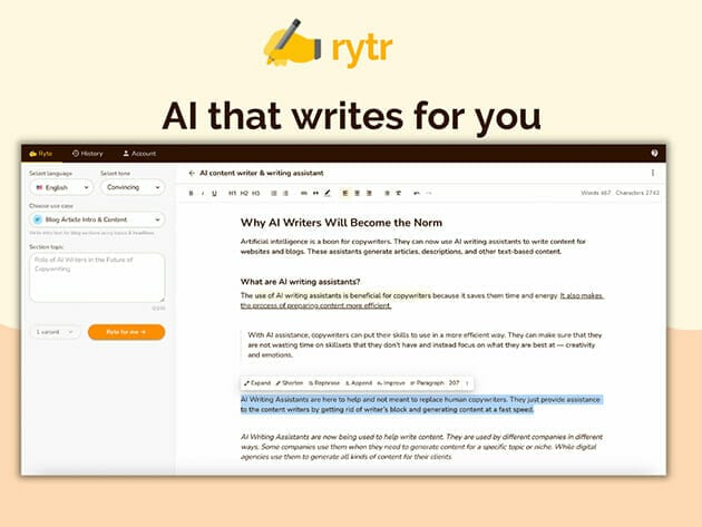 Rytr is a smart writing assistant you always needed but never had. It’s an AI-powered writing tool that helps you create high-quality content, in just a few seconds, at a fraction of the cost! Never face writer’s block again — from emails to ad copy, auto-generate catchy and creative text for your needs. Just like a real human assistant, you can instruct Rytr to write a piece of content in any tone or format you want. Rytr combines state-of-the-art AI with industry best practices and templates to write high-quality content that is guaranteed to perform. It’s blazing fast and fully mobile-optimized too so you can write and edit on the go, without missing any important deadlines.