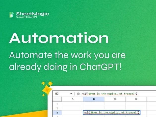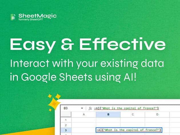 Work around Google Sheets smarter than ever with SheetMagic! Now you can use prompts to create AI content in bulk, automate work, combine cells & so much more. It’s simple to use. All you have to do is call the function =AI(“Your Prompt Here”) and you will get a response in a second or two! No limitations too: just add in your OpenAI API key & you can create as much content as you want without limitations. SheetMagic is a simple, but effective tool to use GPT in Google Sheets!