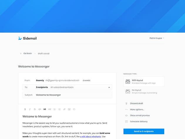 Sidemail is a modern email service for sending transactional and promotional emails. Send beautiful, responsive emails that look great in any inbox. View stats on a beginner-friendly dashboard, start using email automation and access the world’s most easy-to-use email sending API. Sidemail comes packed with templates for any scenario and functionality to let you hit the ground running — in minutes. Meaning, you get to focus on what you do best, while your whole email game is as simple as making a cup of coffee. From delivery schedule and email design to automation and analytics, Sidemail got you covered.