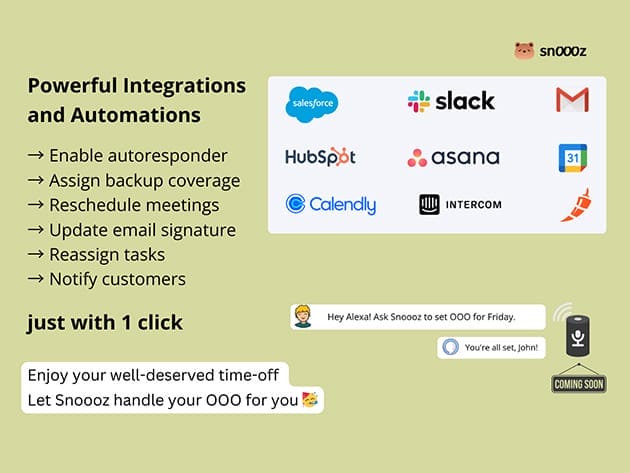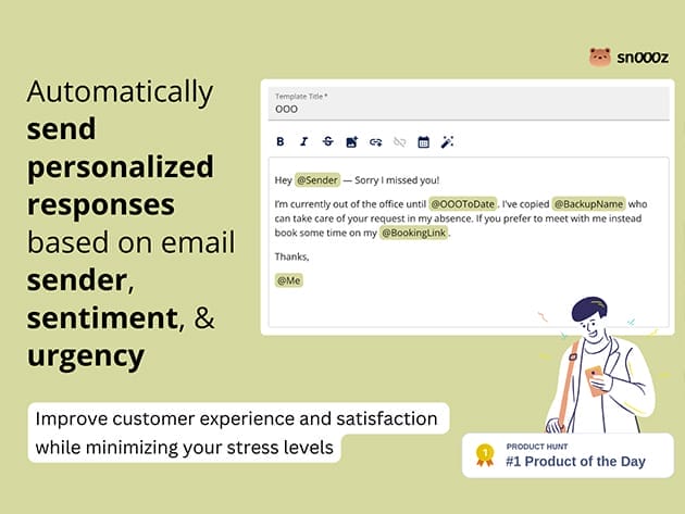 Snoooz is an intelligent AI assistant that can automatically send personalized Out-of-Office (OOO) messages to your prospects or customers, decline/reschedule your meetings, label emails for easier follow-ups, assign backups, create coverage plans, find exclusive travel discounts, and much more.