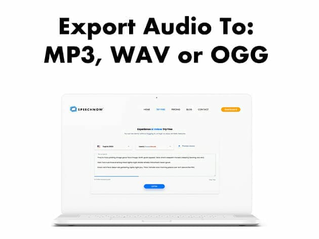Create Your File. Once you’re happy with your voice & the reading quality, export your file in MP3, WAV, OGG or WEBM format!