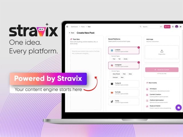 Stravix is a single workspace that learns your voice, plans the next 7 to 30 days, writes for each channel, includes images, and lets you edit in place. No prompt walls. Light instruction when you need it.