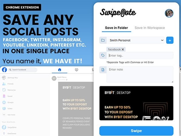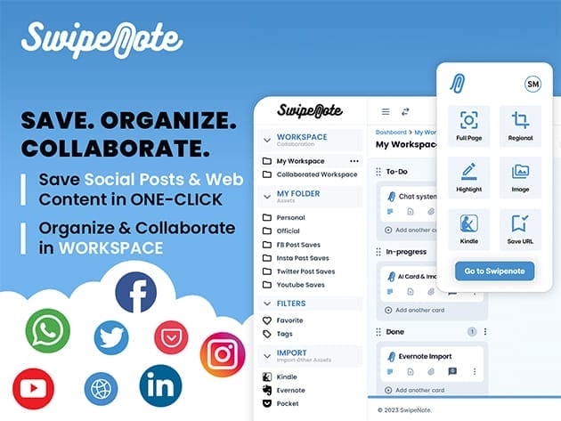 SwipeNote is the ultimate digital organization and collaboration tool that seamlessly integrates web content management and project coordination. With its powerful Chrome extension, you can save social media posts, capture screenshots, and bookmark URLs with a single click. The intuitive web app then allows you to organize saved content into unlimited folders, manage projects with task assignments, deadlines, and reminders, and collaborate with your team using real-time chat and task tracking. Whether you’re organizing personal content or working with a team, SwipeNote provides a comprehensive platform to streamline your workflow, enhance productivity, and ensure success.