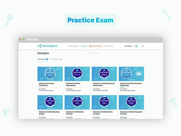 Holding a Salesforce certification significantly enhances a professional’s value in the job market and can make them stand out from competitors. The 2023 Salesforce Certification Exam Training: Lifetime Subscription prepares you for that. The training includes practice exam questions and study guides for various certifications, covering a wide range of roles such as administrators, developers, architects, sales representatives, and marketing cloud professionals. With lifetime access to the resources, professionals can continually update their skills and stay ahead in the evolving Salesforce landscape. Regardless of your professional role, ForceDigest provides a tailored path specifically designed for you.