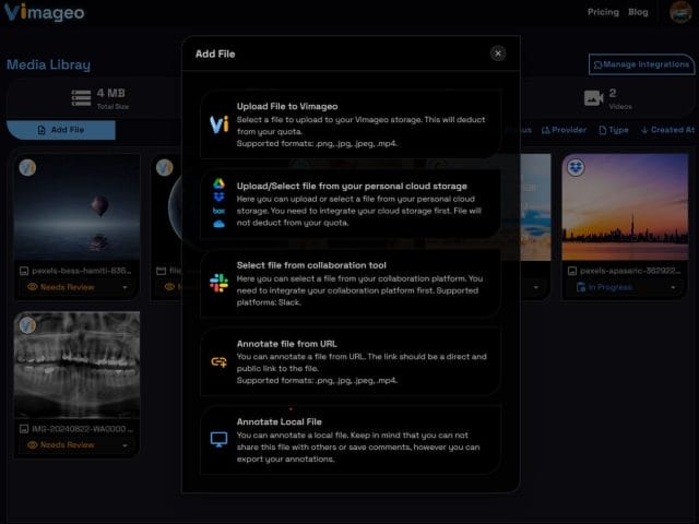 Upload files or connect external storage like Google Drive or Box, add timestamped video comments or image markups, and share instantly with clients or teammates. You can organize activity logs, and export annotations for documentation or review.