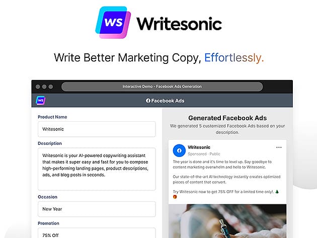Built on top of OpenAI’s GPT-3 technology, Writesonic is a true AI SaaS tool that helps you write copy effortlessly. By analyzing your inputs, pattern-matching, AI, Writesonic crafts catchy landing pages, ads, product descriptions, and more. It’s like having a professional copywriter at your disposal at a fraction of the cost. Writesonic is also trained on high-performing content from top brands. It knows what to convert and how to write copy that resonates with your audience. This is an ideal tool for entrepreneurs, copywriters, marketers, and sales. Get more leads, sales, and brand recognition with less time invested in copywriting.